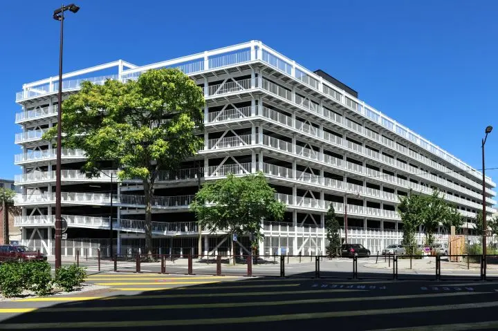 Le parking silo se structure en deux bâtiments de 7 niveaux. Il est constitué d’une structure métallique, en concordance avec l’esprit industrielle du site. Des coursives extérieures pour les piétons constituent autant de balcons sur la ville. Les 7 niveaux sont naturellement ventilés et éclairés, et animés des mouvements de circulation qui donnent à cet ensemble de 23 mètres de haut une dimension urbaine et spectaculaire.