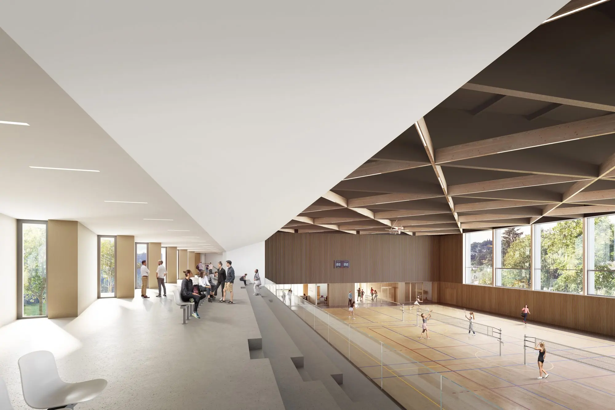La forme compacte du bâtiment limite les déperditions et réduit les consommations tout en profitant de la lumière naturelle. Elle est propice à la mise en place d’une ventilation naturelle efficace. Allègement de l’empreinte carbone grâce à une structure mixte : socle et murs porteurs en béton bas carbone, voiles et charpente en bois biosourcé, couverture en bacs acier et bardages métalliques. Une enveloppe très performante, associée à des équipements techniques efficaces, permet au bâtiment de bénéficier d’une très faible consommation d’énergie, compensée en partie grâce aux panneaux photovoltaïques en toiture.