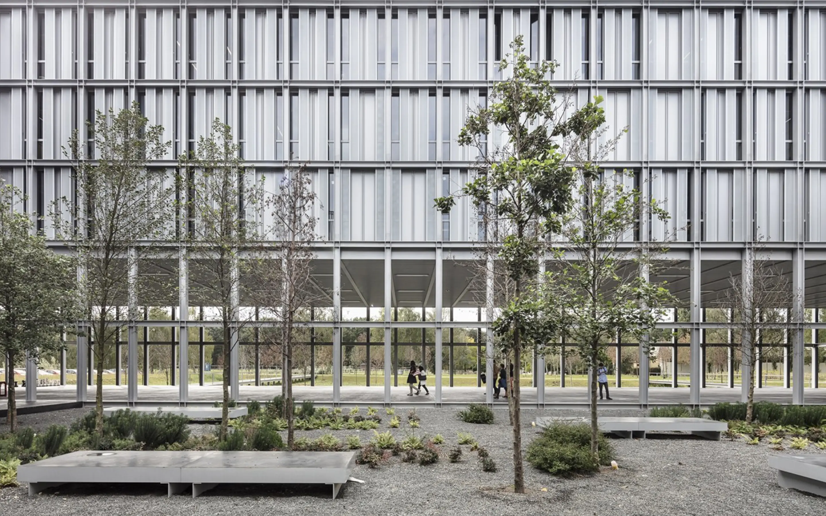 Construction du bâtiment d'enseignement supérieur et de recherche : Salles de cours, bureaux administratifs et de chercheurs, locaux de direction, bibliothèque, amphithéâtres partagés, espace de formation continue, Centre d'Accès Sécurisé aux Données.